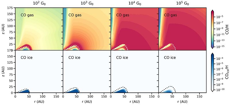 With this tool in hand, we could finally explore the chemistry systematically. Applying it to CO across a comprehensive parameter grid revealed some interesting trends. External UV irradiation acts as a second-order effect on disk chemistry, with its importance depending critically on stellar mass. For massive stars (≥3 solar masses), stellar heating dominates completely and external fields barely matter. But for lower-mass stars (≤0.6 solar masses), external fields of 1000 G₀ or stronger can fundamentally alter the CO gas-ice balance across much of the disk.