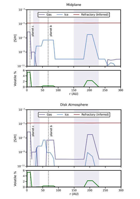 As shown in the Figure below, this analysis revealed striking vertical and radial patterns. In the disk midplane, almost all volatile sulfur exists as ices beyond 30 AU, with gas-phase species becoming dominant only in the warm inner cavity. The disk's atmosphere shows a different pattern - while most material remains in refractory form, there's a transition from gas to ice around 60 AU, driven by changes in UV irradiation and temperature. In total, we found that volatile sulfur (gas + ice) accounts for only 0.01-5.3% of the total sulfur budget, depending on location, with the vast majority presumably locked away in refractory materials.