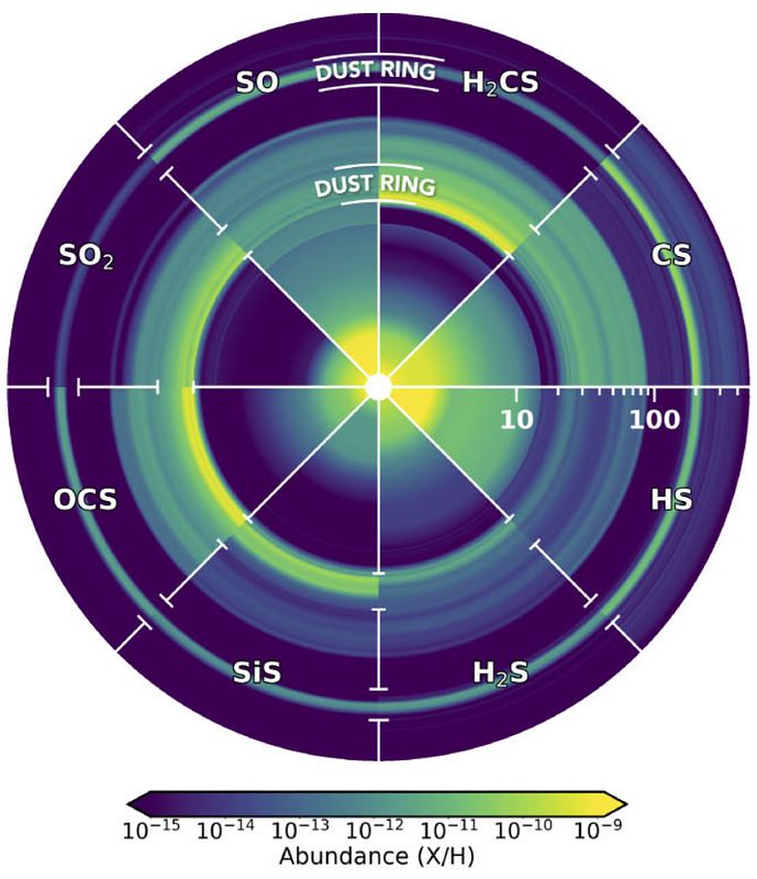 This complex chemical structure is illustrated in the Figure below, which presents modelled abundances for eight key sulfur-bearing molecules across the disk. The abundance patterns show clear correlations with disk features like dust rings and gaps, suggesting a potential connection between the disk's physical evolution and its sulfur chemistry.
